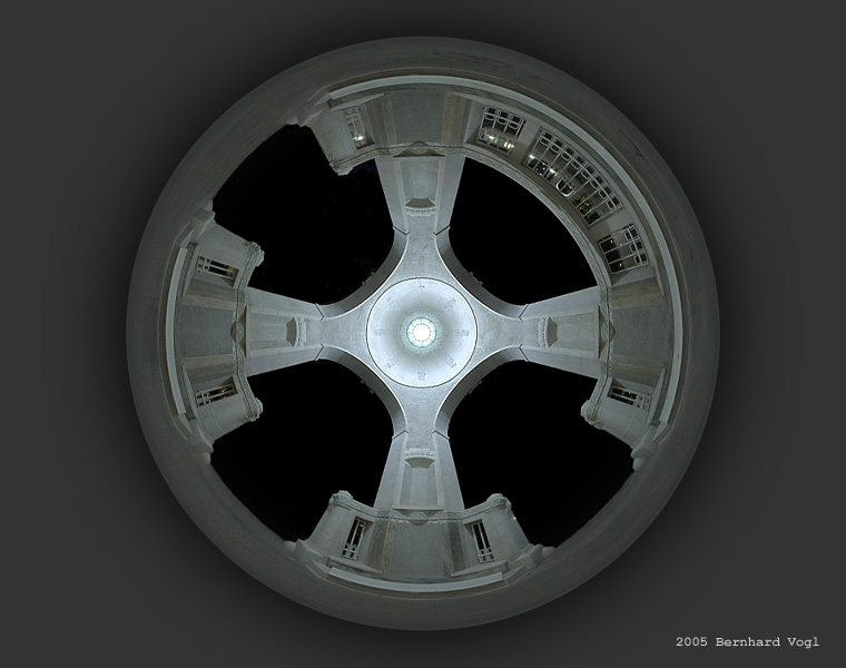 Vollsphärisches Panorama, als "Mirror Ball" mit HDRShop umgerechnet (entspricht einer fotografierten Reflektion an einer Glaskugel). Bildränder manuell nachbearbeitet.