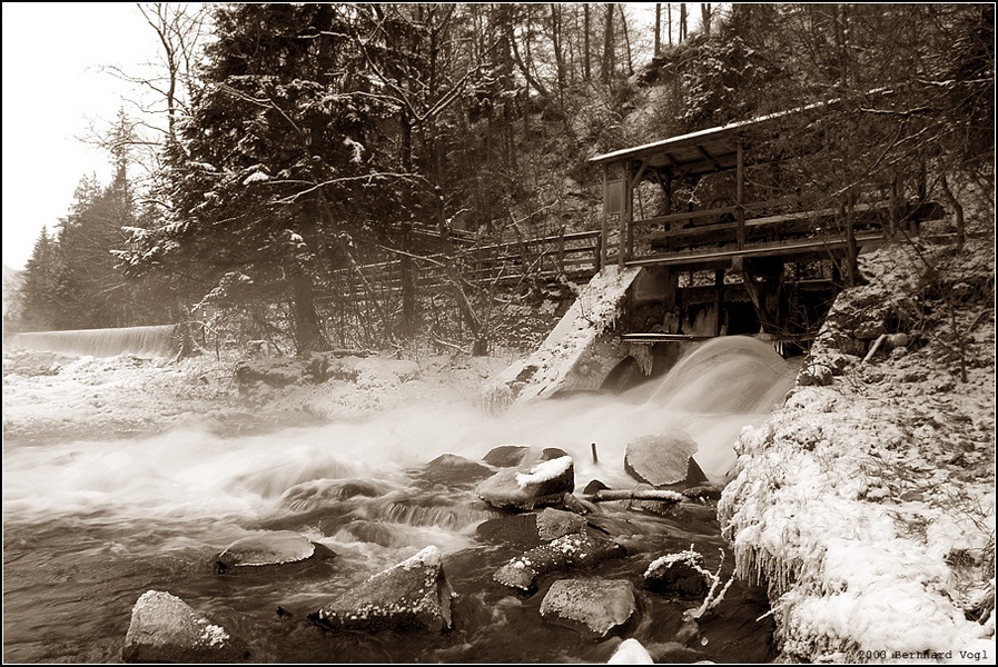 Winterliche Wehr an der Traun Kohlwehr, Oberösterreich