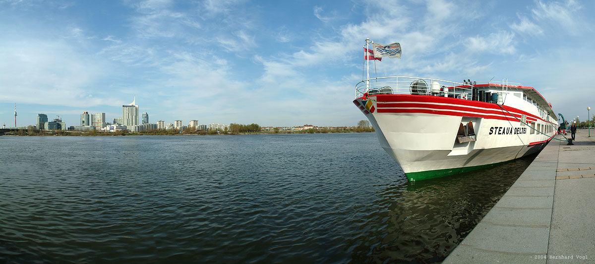 Das rumänische Passagierschiff Deltastar an der Schiffslände in Wien. Im Hintergrund ist die Donaucity zu sehen.