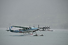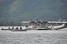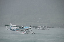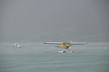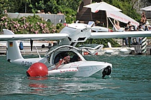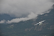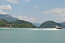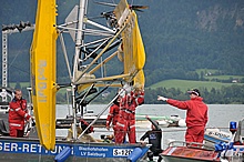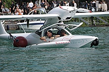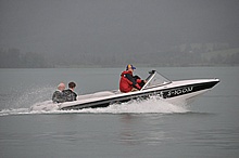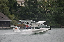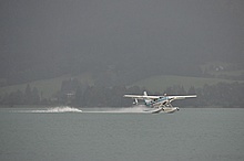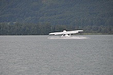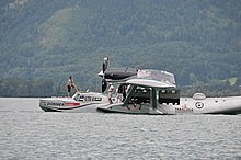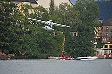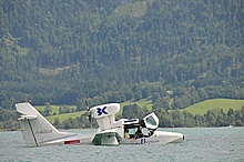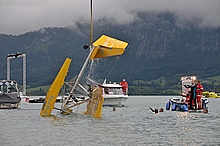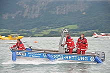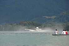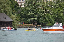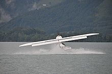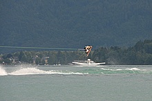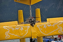 Der Nachmittag begann ganz hoffnungsvoll mit schönem Wetter und viel Sonnenschein. Klaus und ich mieteten ein Elektroboot um näher an die Flugzeuge heranzukommen, wurden aber vor dem Beginn der Flugshow wieder ans Ufer gelotst da sich ein veritables Unwetter ankündigte. Alle Wasserflugzeuge wurden draußen am See festgemacht, was sich für das Ultraleichtflugzeug als keine gute Idee entpuppte. Leider von mir unbemerkt hat es der Sturm versenkt. Fotos gibt's also nur von der Bergung...